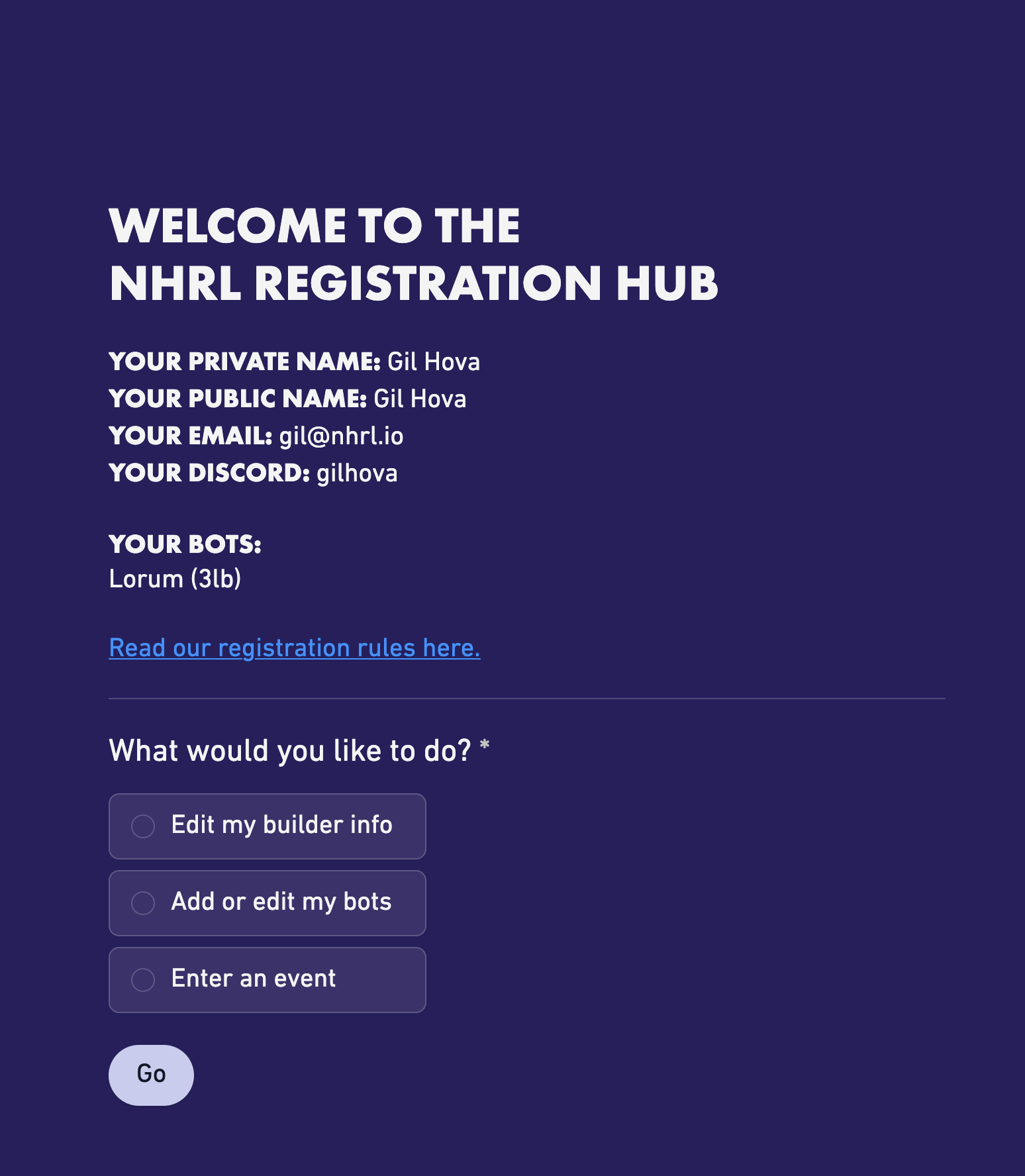 The NHRL Registration Hub is, as of the October 2025 event, where you will sign up to compete at NHRL.